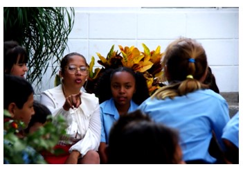 Que linda nuestra maestra de ficción, una actriz espontanea y muy capaz, que regaña bastante en las escenas, pero en la realidad se porta como una verdadera "compañera" de trabajo que apoya a los niños ylo hace jugar participando, y sobre todo que lo hace sentir parte de una gran familia.